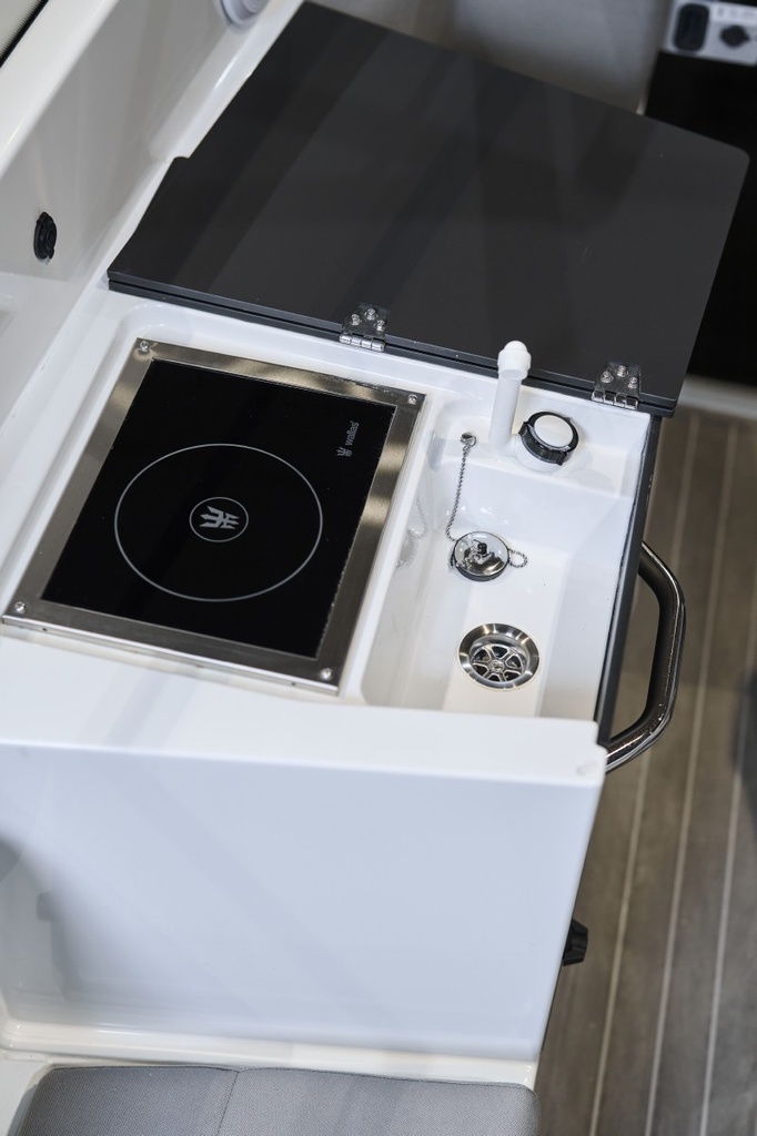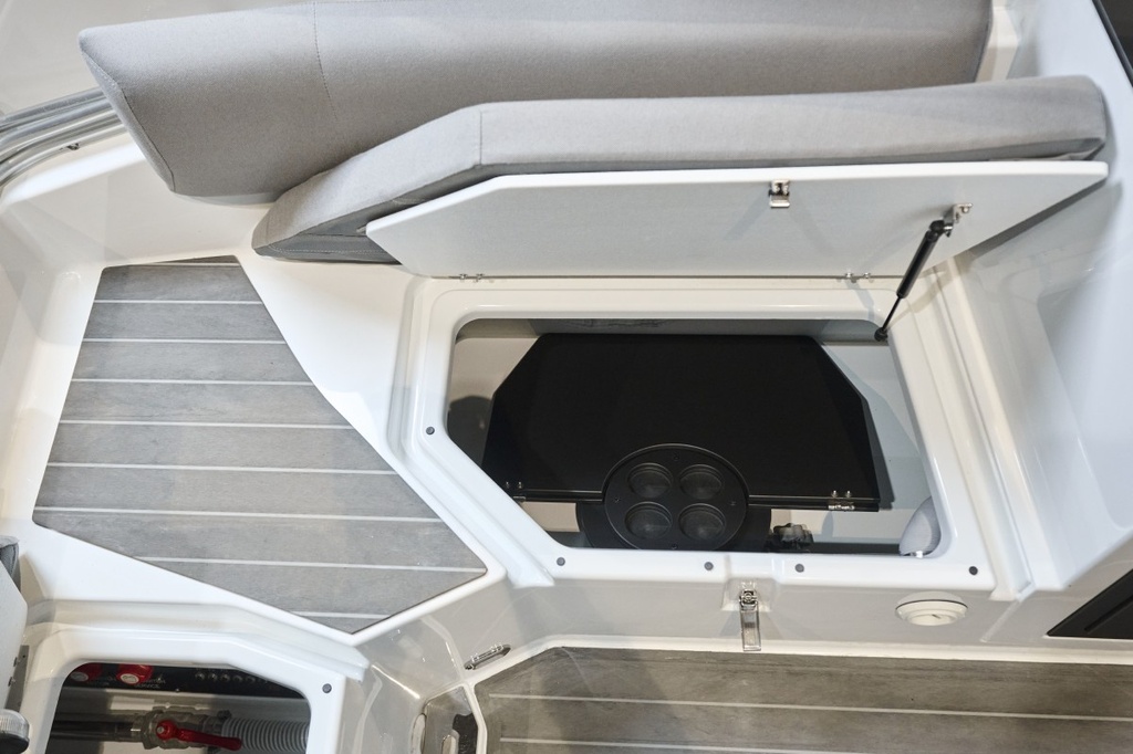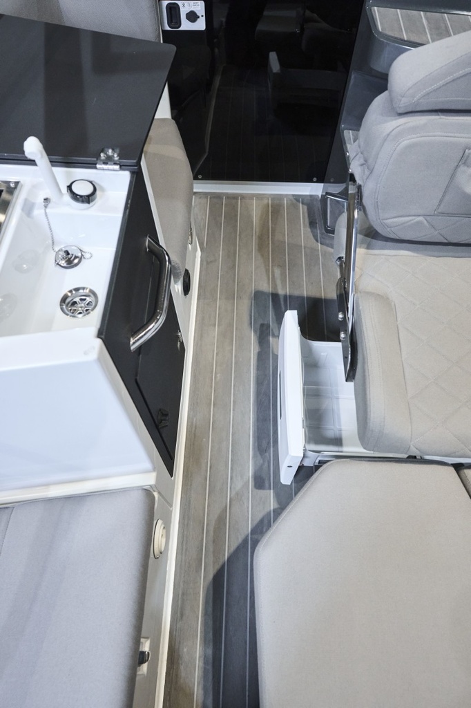 Leveän vesilinjan ansiosta vene on vakaa ja kulku tasaista. 250 hp:n moottorilla vauhti nousee jopa 46 solmuun.